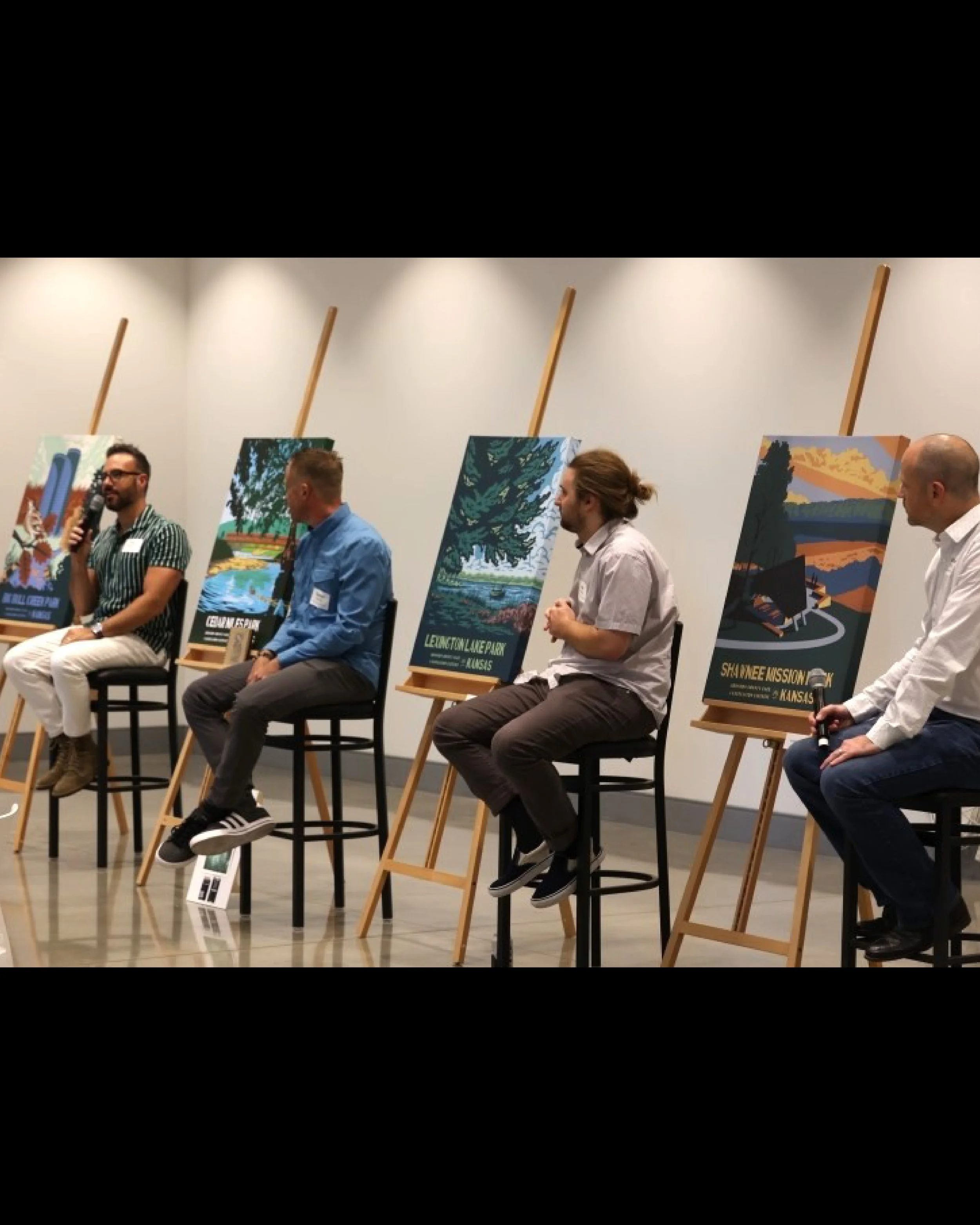 Tad Carpenter, Daniel Bartle, Luke Wittman (me), and Michael Perry on the panel for the poster reveal event at the Johnson County Arts & Heritage center.